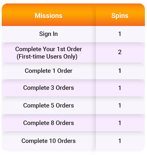 Complete the missions below and earn Spin Ticket for each mission. The more you order, the more tickets you collect and the more chances you get to win!