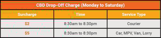 For jobs with pickup outside of CBD area and drop-off or any of the drop-offs within CBD area, CBD surcharges apply Monday to Saturday from 6:30am to 8:30pm.