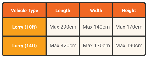 Recommend for house moves as these lorries can comfortably fit most furniture, refrigerators upright, washing machines and queen size mattresses. For larger house moves, taller refrigerators ( Above 1.7m) and king size mattresses, the 14 feet lorry is recommended.