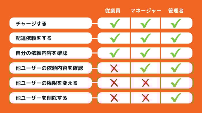 Lalamove法人アカウントでは、1つのアカウントに最大20名のユーザー登録が可能で、3つの権限に分けることができます。これにより、チーム全体で配送管理をすることが可能になります。
