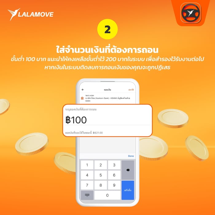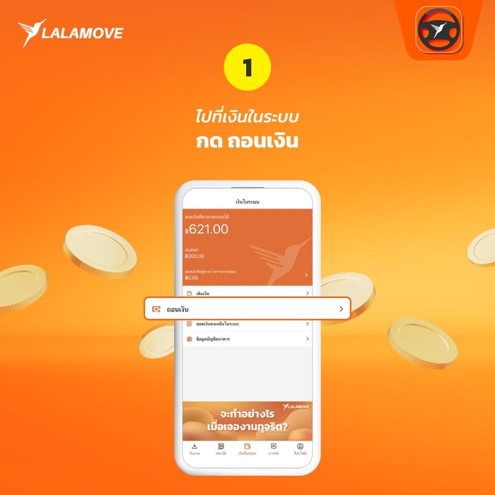 3. กดคำว่า ""ถอนเงิน"" (หากเป็นคนขับใหม่ คนขับจะต้องเพิ่มบัญชีธนาคารให้เรียบร้อยก่อน ใช้เป็นธนาคารกสิกร ที่เป็นชื่อของคนขับเท่านั้น)