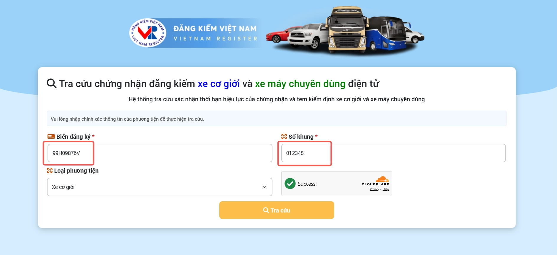 Bước 1: Điền Biển đăng ký + chữ "V" và số 6 số cuối của Số khung xe. (Ví dụ: Biển đăng ký: 99H09876V và Số khung: 012345)