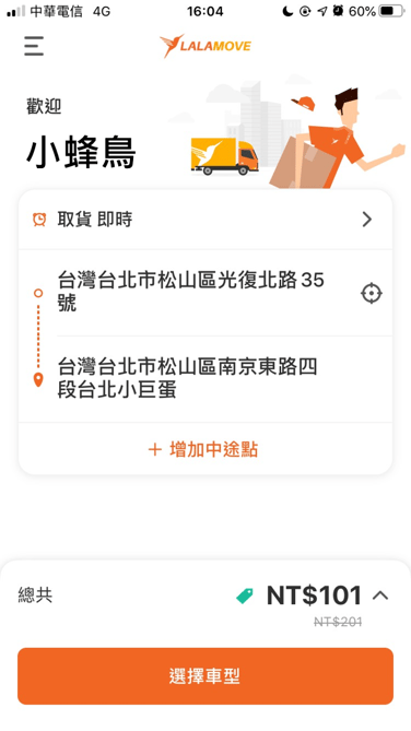 1.登入Lalamove會員後,在下訂單頁面中輸入取件地點與送件地點