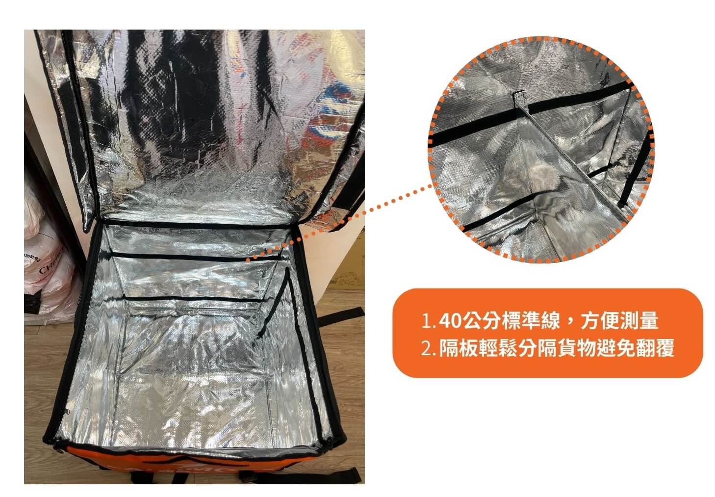 不過特別注意!若司機夥伴是使用新款保溫袋配送舊款的保溫袋訂單,也就是沒有加價的保溫袋,載送容量就是舊版的40x40x40,這在新款的保溫袋有標示線可以清楚劃分哦!