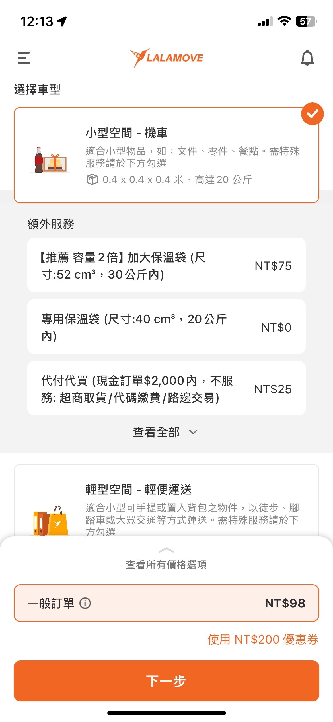 想要體驗新款保溫袋非常簡單💡!在下單時,只需選擇「小型空間-機車」裡的額外服務「加大保溫袋」選項,並支付額外的 加價費用,即可享受容量更大、防水更佳的全新保溫袋配送服務。