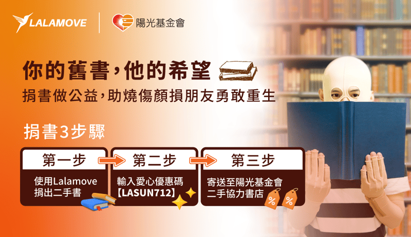 「你知道一本舊書,就可能改變他人的人生嗎?」陽光社會福利基金會與Lalamove攜手合作,共同發起公益計劃-二手書捐贈活動!透過二手書捐贈活動,不僅僅是將書本與知識傳遞下去,更是將愛心轉為實際行動。透過你的參與,將能夠幫助經歷燒傷和顏面損傷的朋友們重新展開笑顏,重拾對生活的信心。