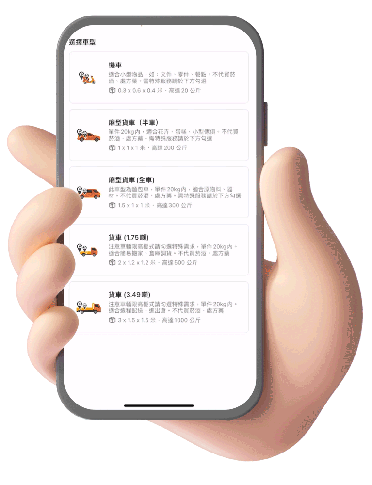 只要選好需要的車型,在APP內輸入起訖點,即可立即獲得運費報價喔!