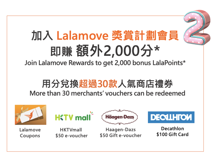 - 輸入優惠碼並成功登記成為Lalamove獎賞計劃會員可享2,000 Lala積分,積分將於將於活動期後7-14個工作天內自動新增到合資格Lalamove獎賞計劃會員的帳號內
